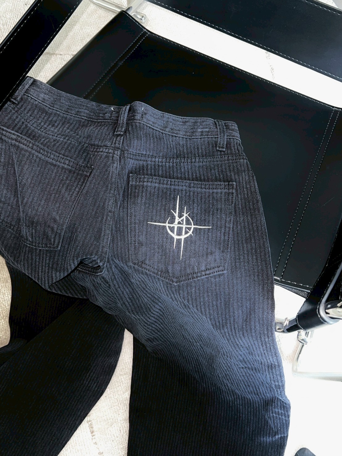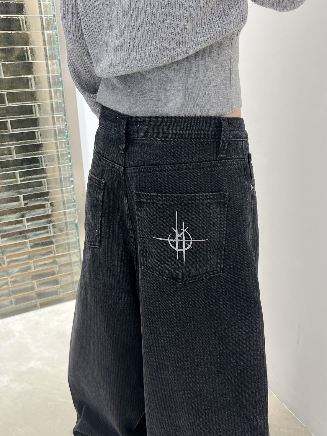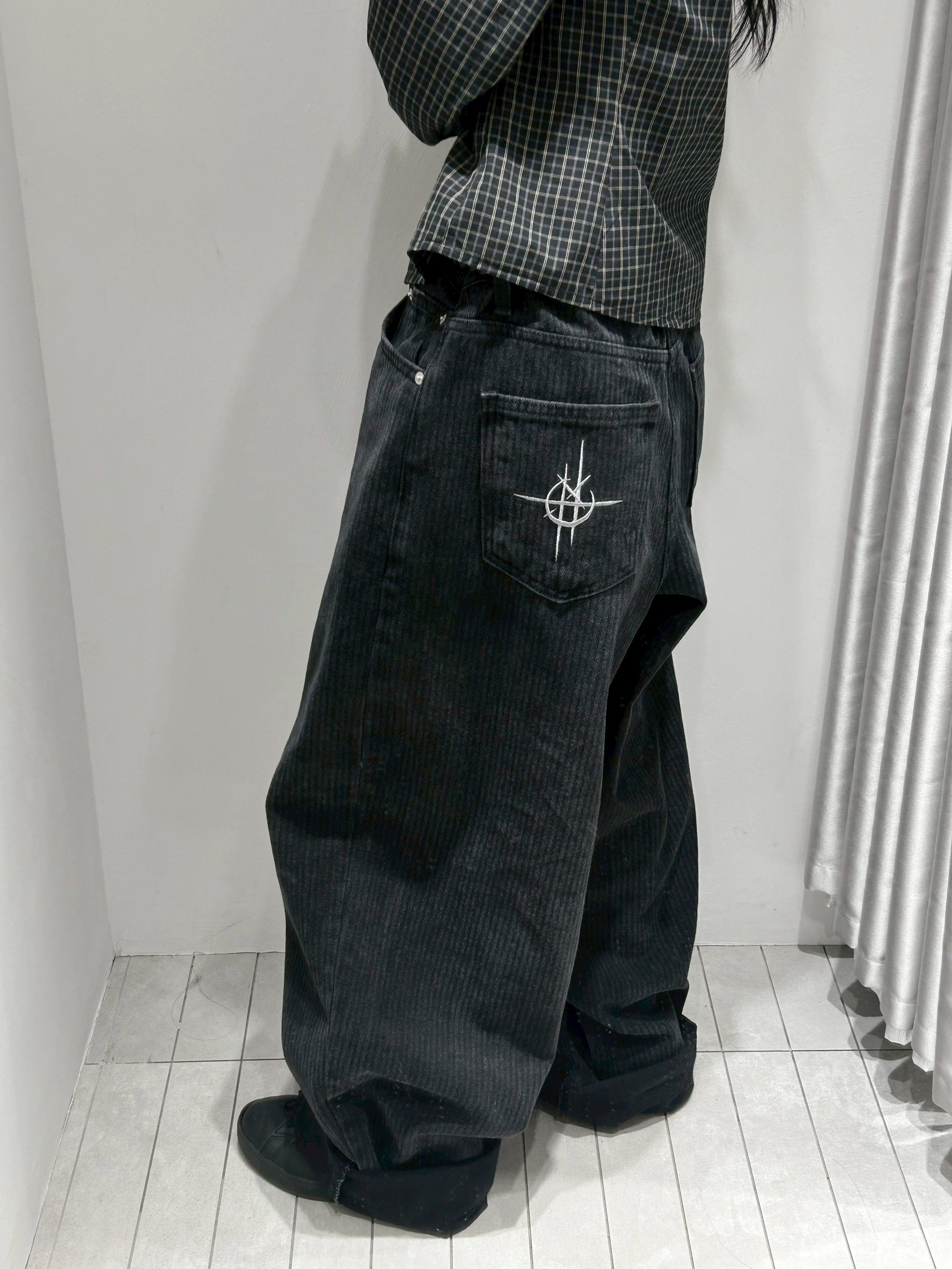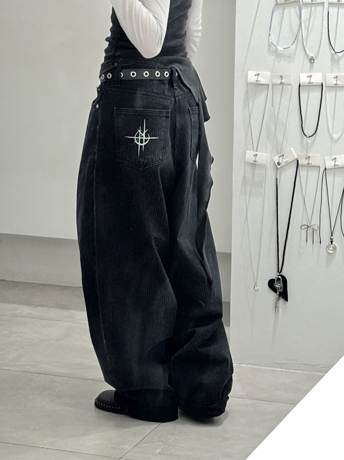 上弦日環蝕刺繡 刷直紋牛仔褲