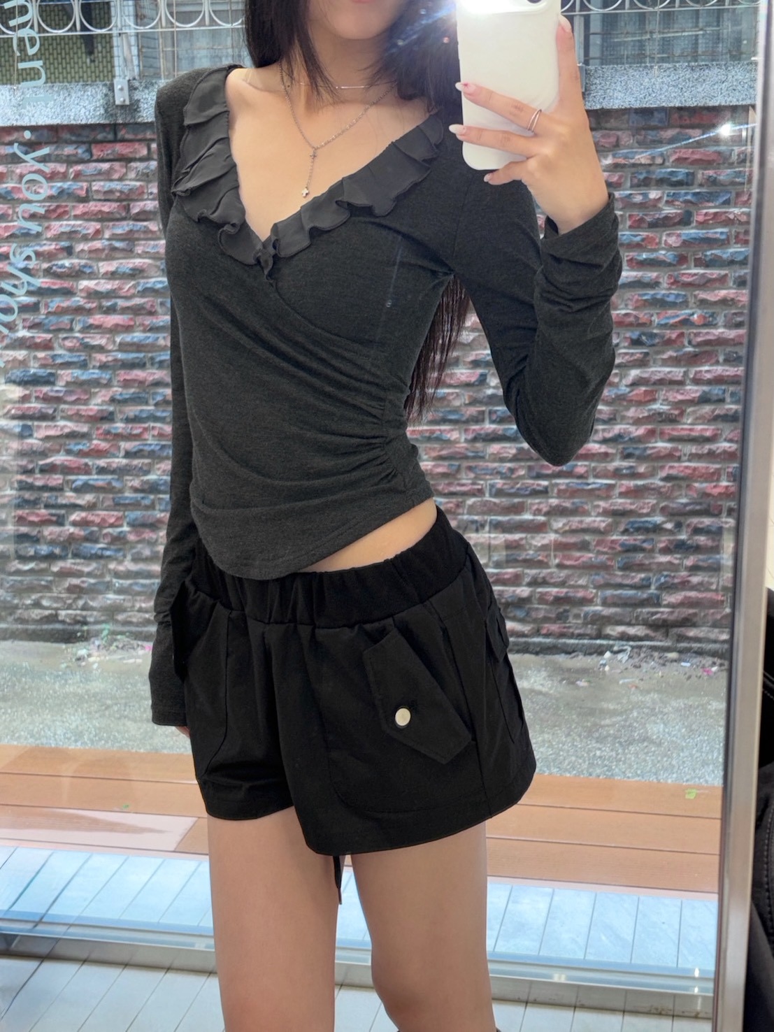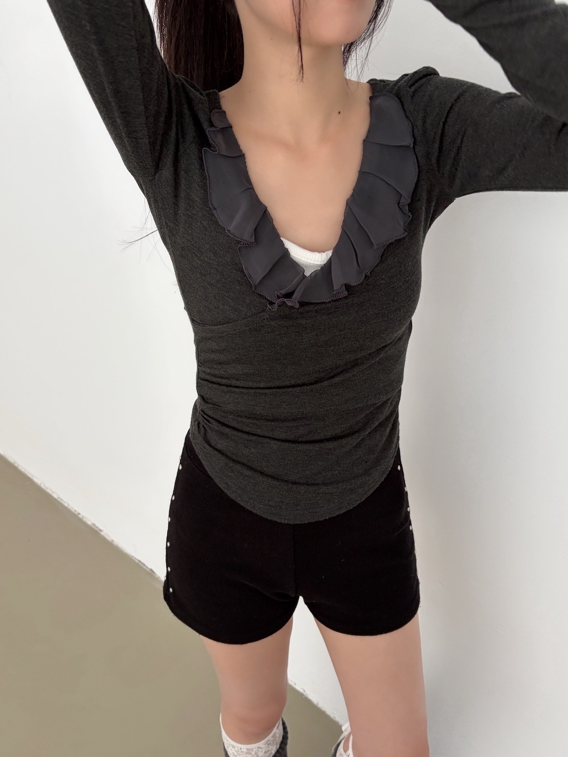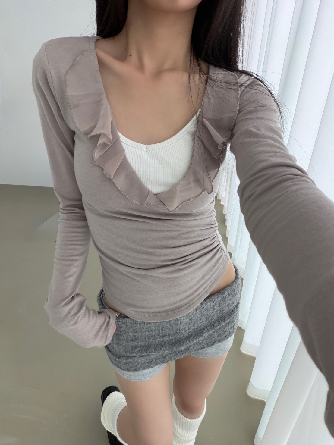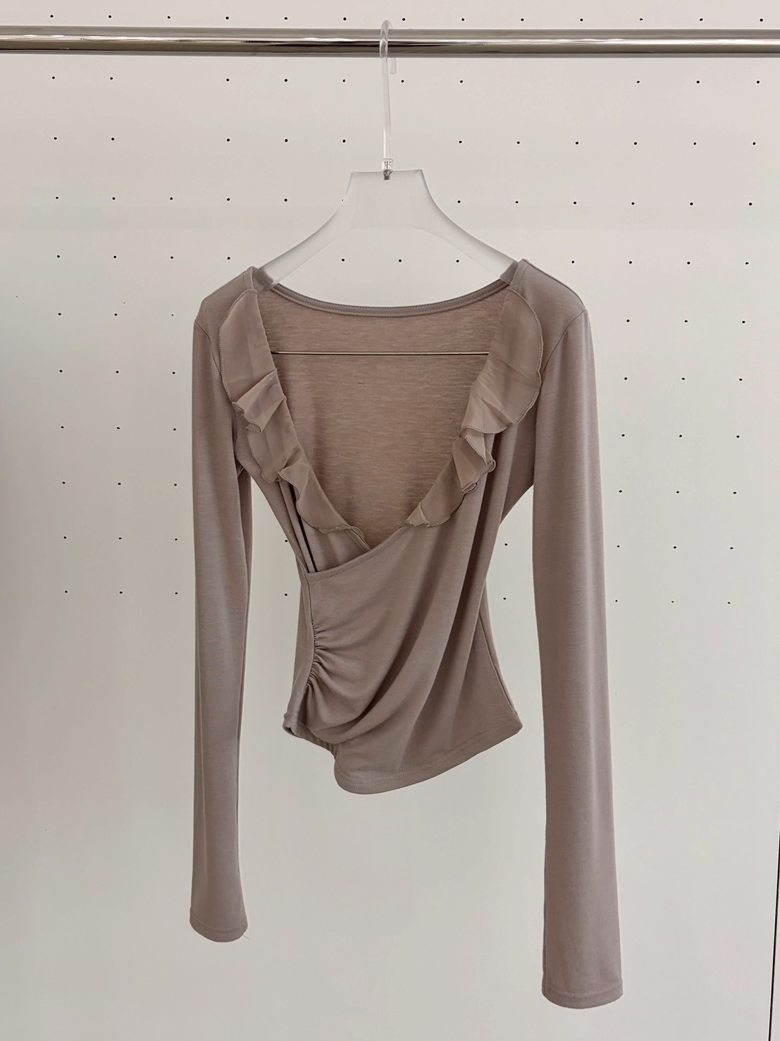 預購交叉雪紡荷葉V領側腰抓皺上衣