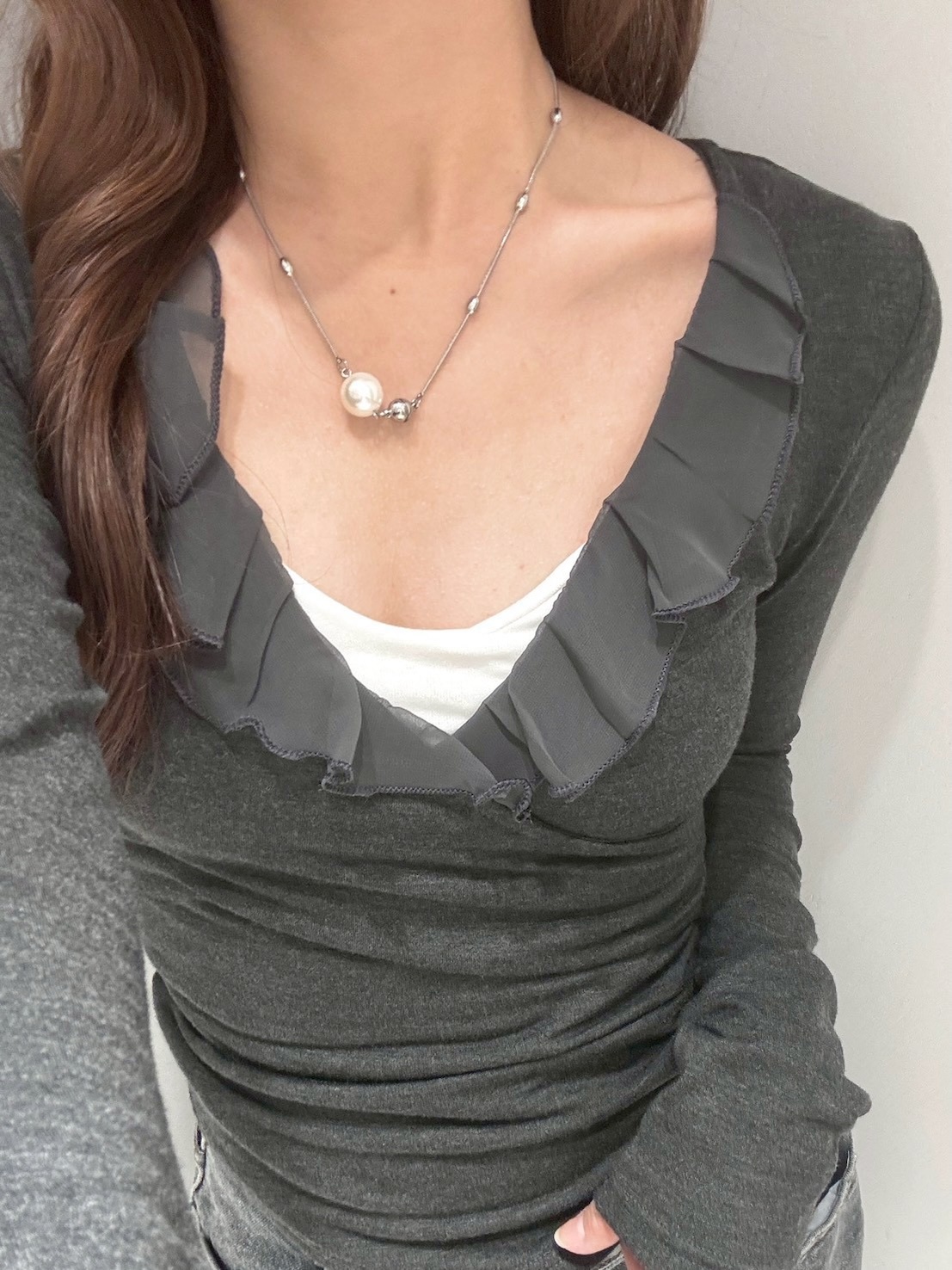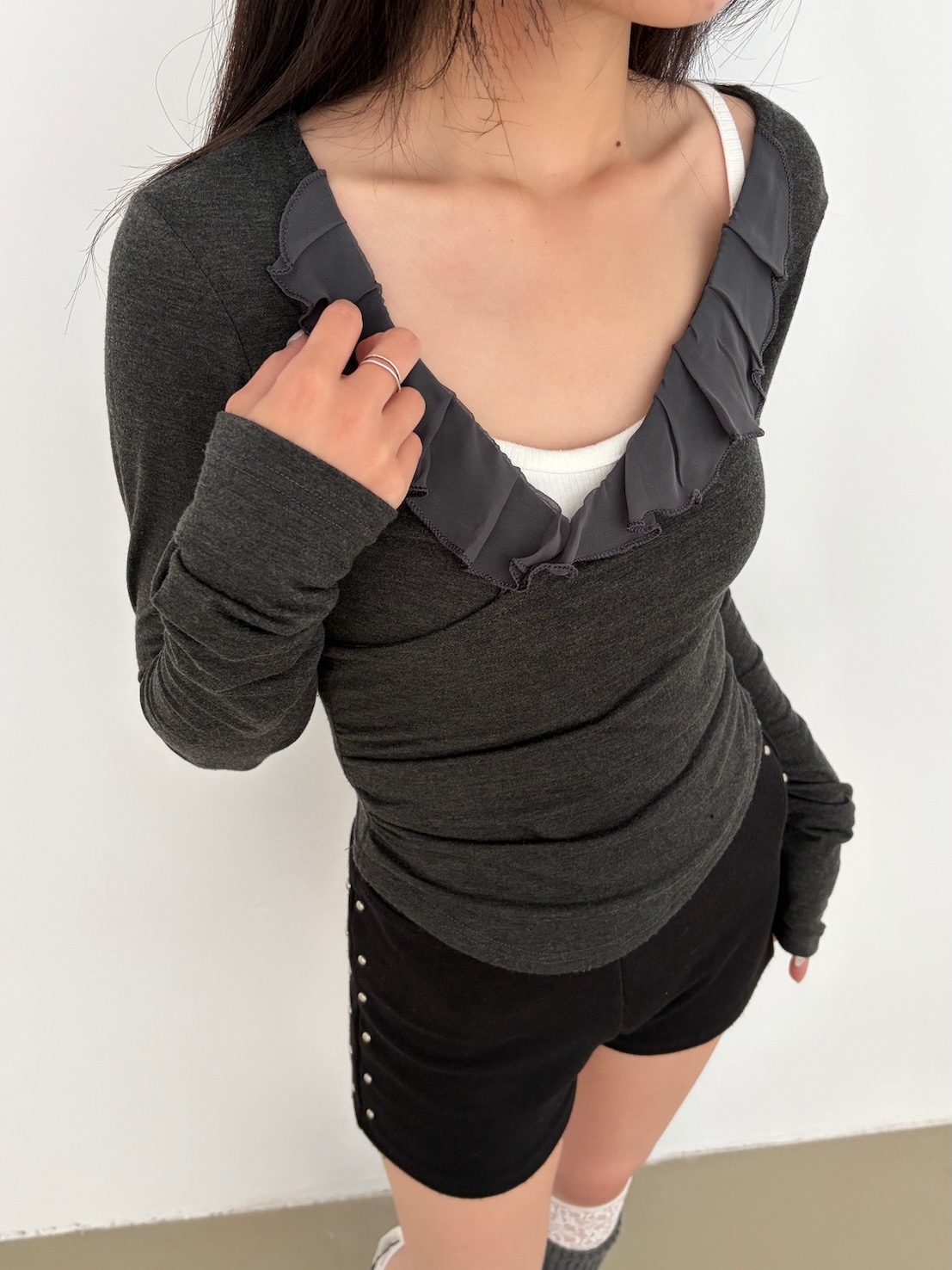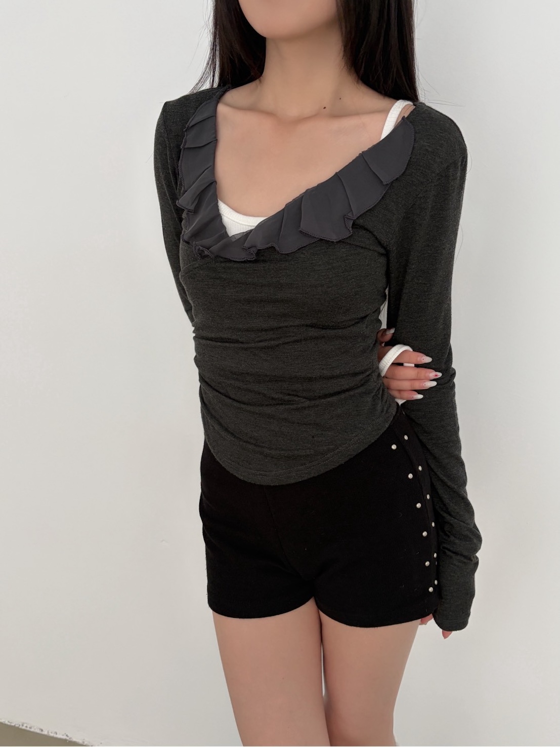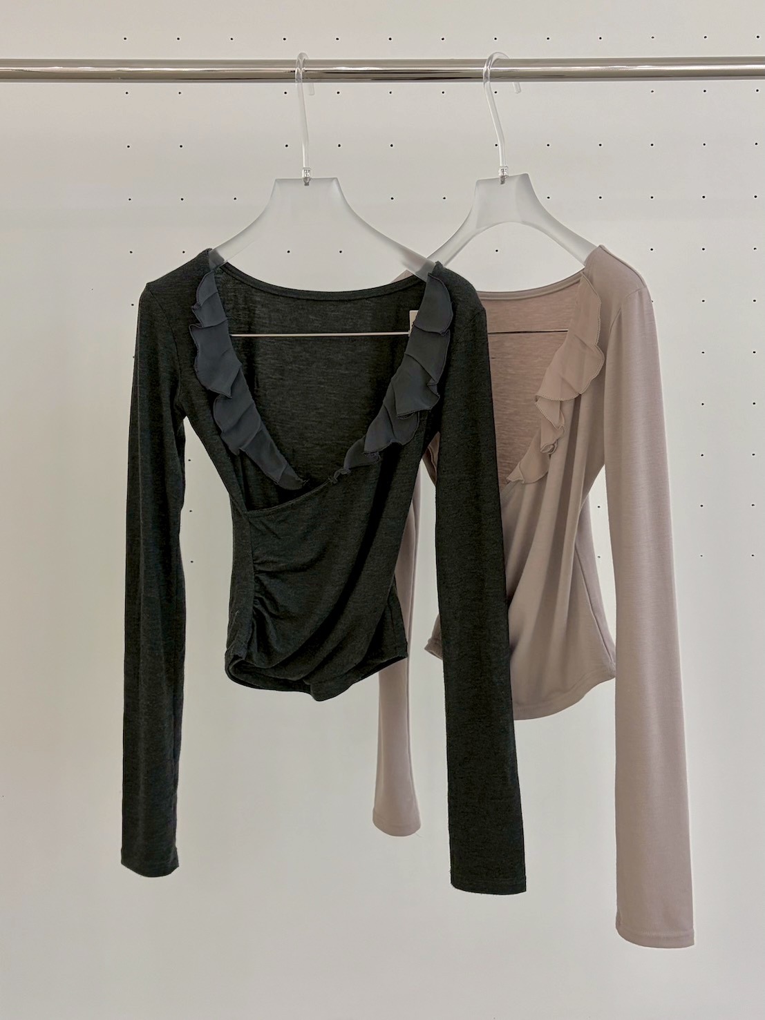 預購交叉雪紡荷葉V領側腰抓皺上衣
