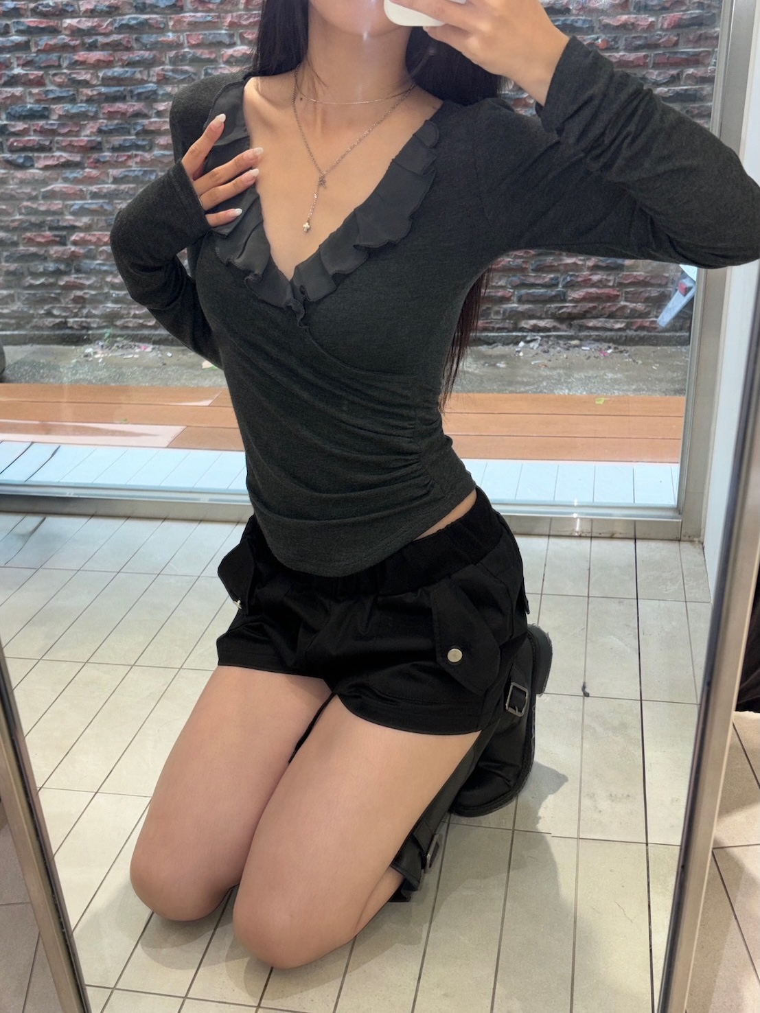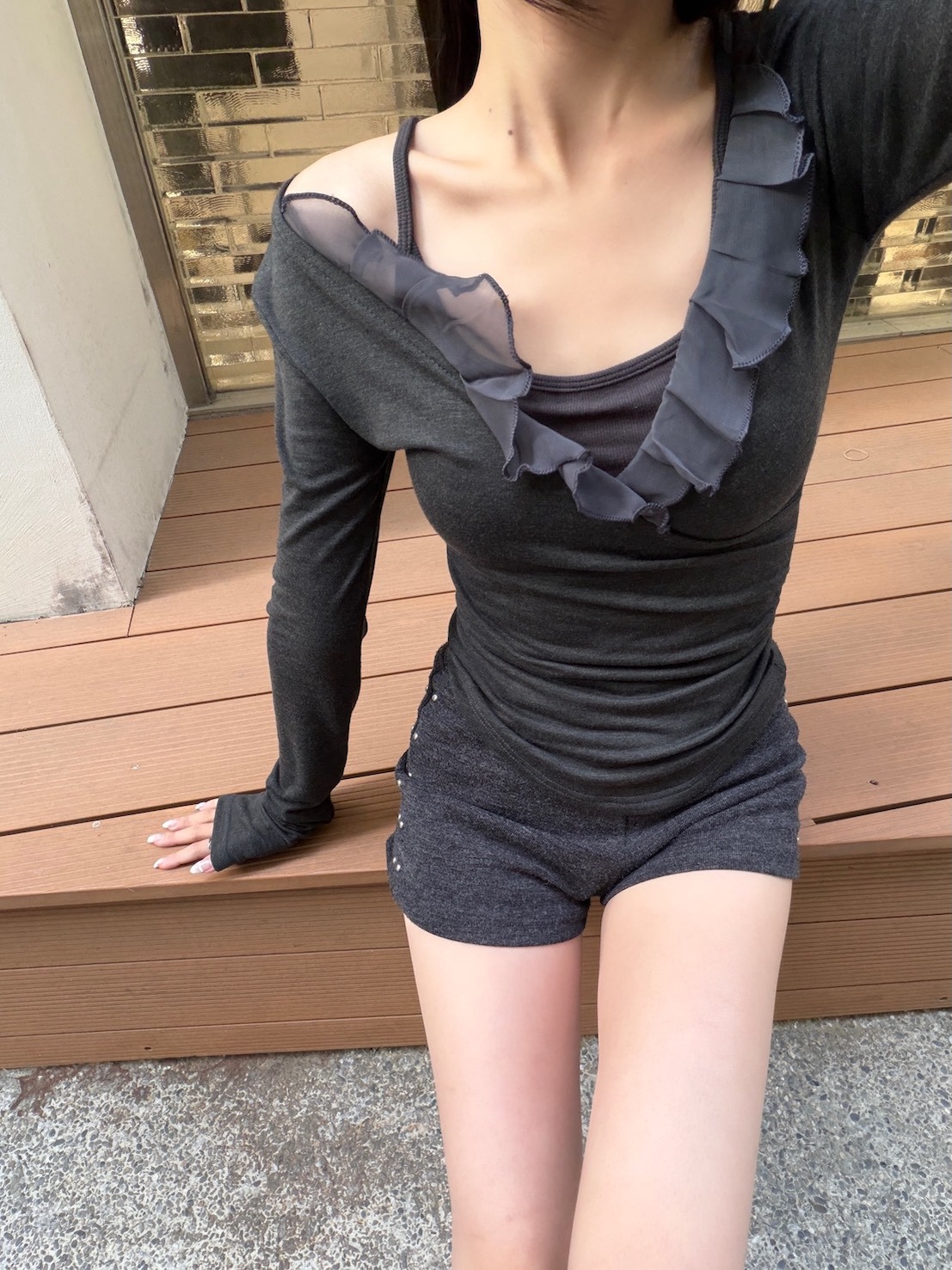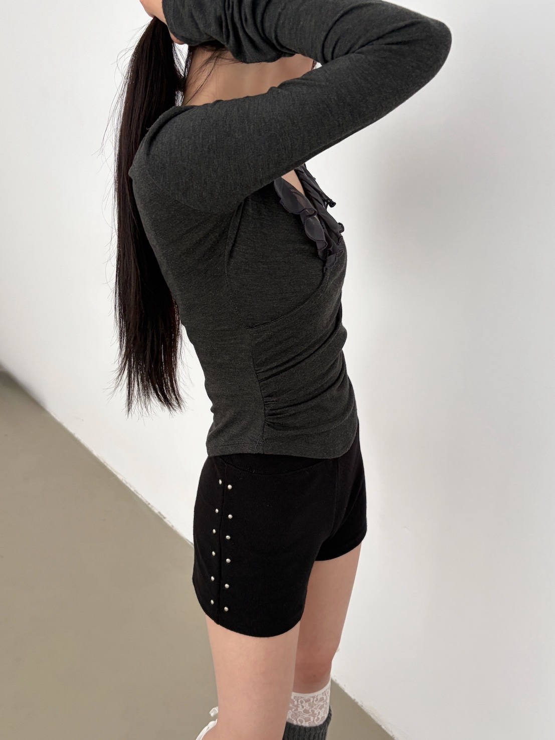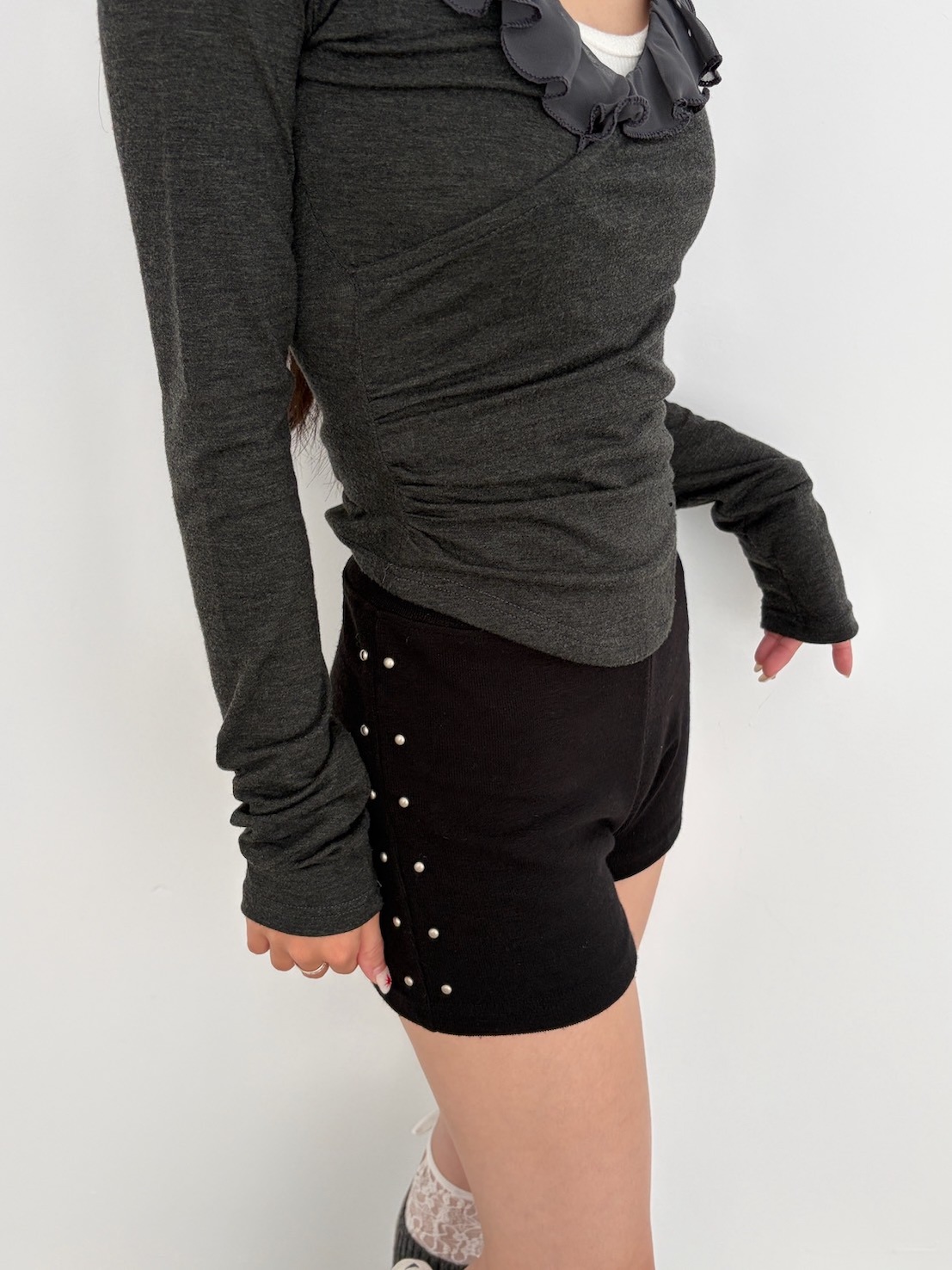 預購交叉雪紡荷葉V領側腰抓皺上衣