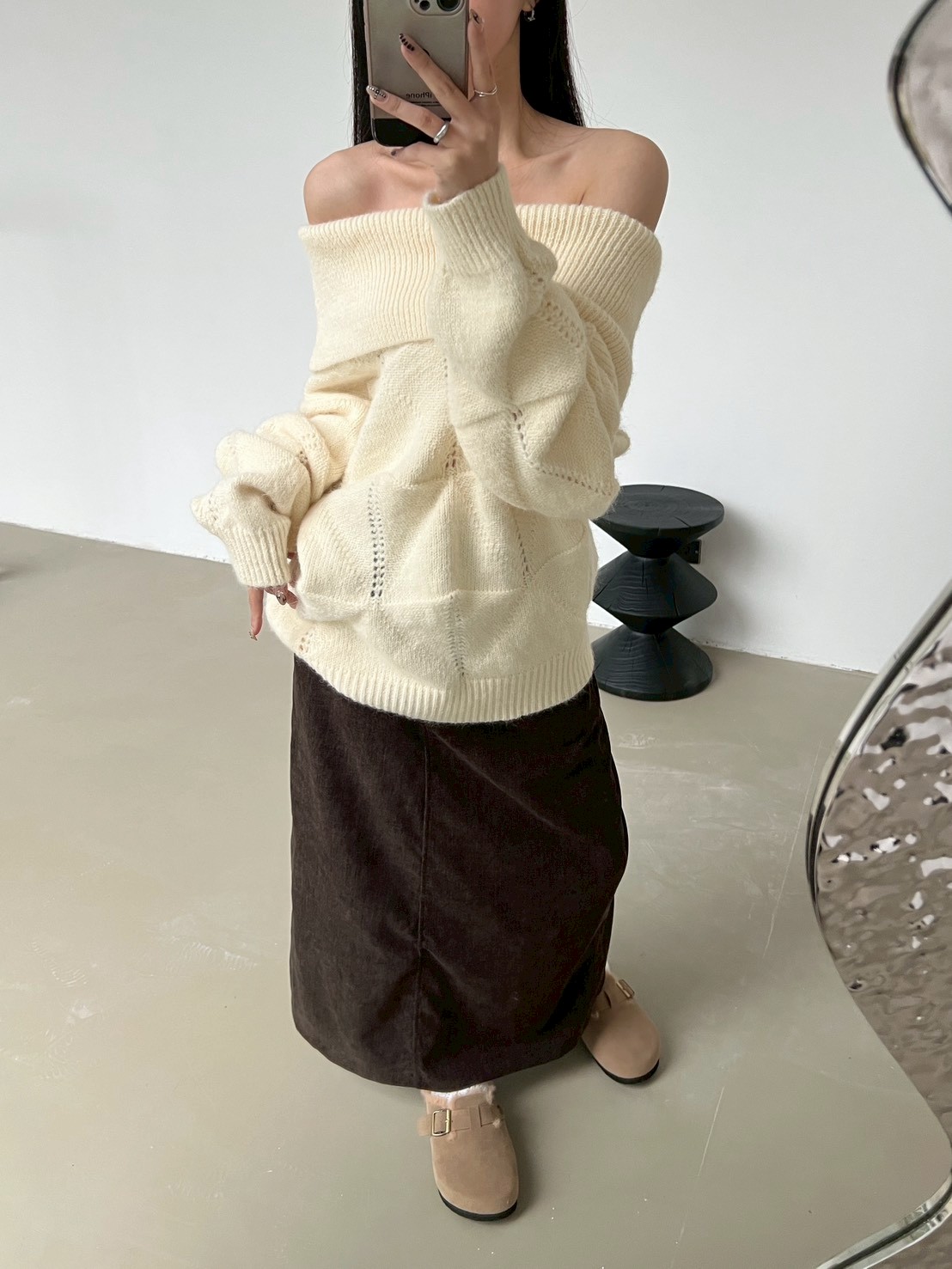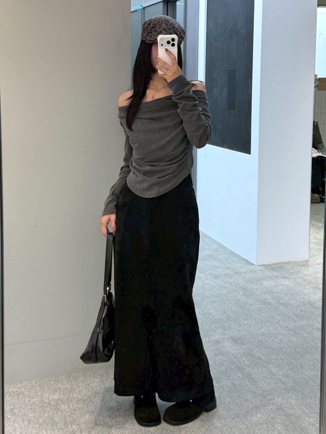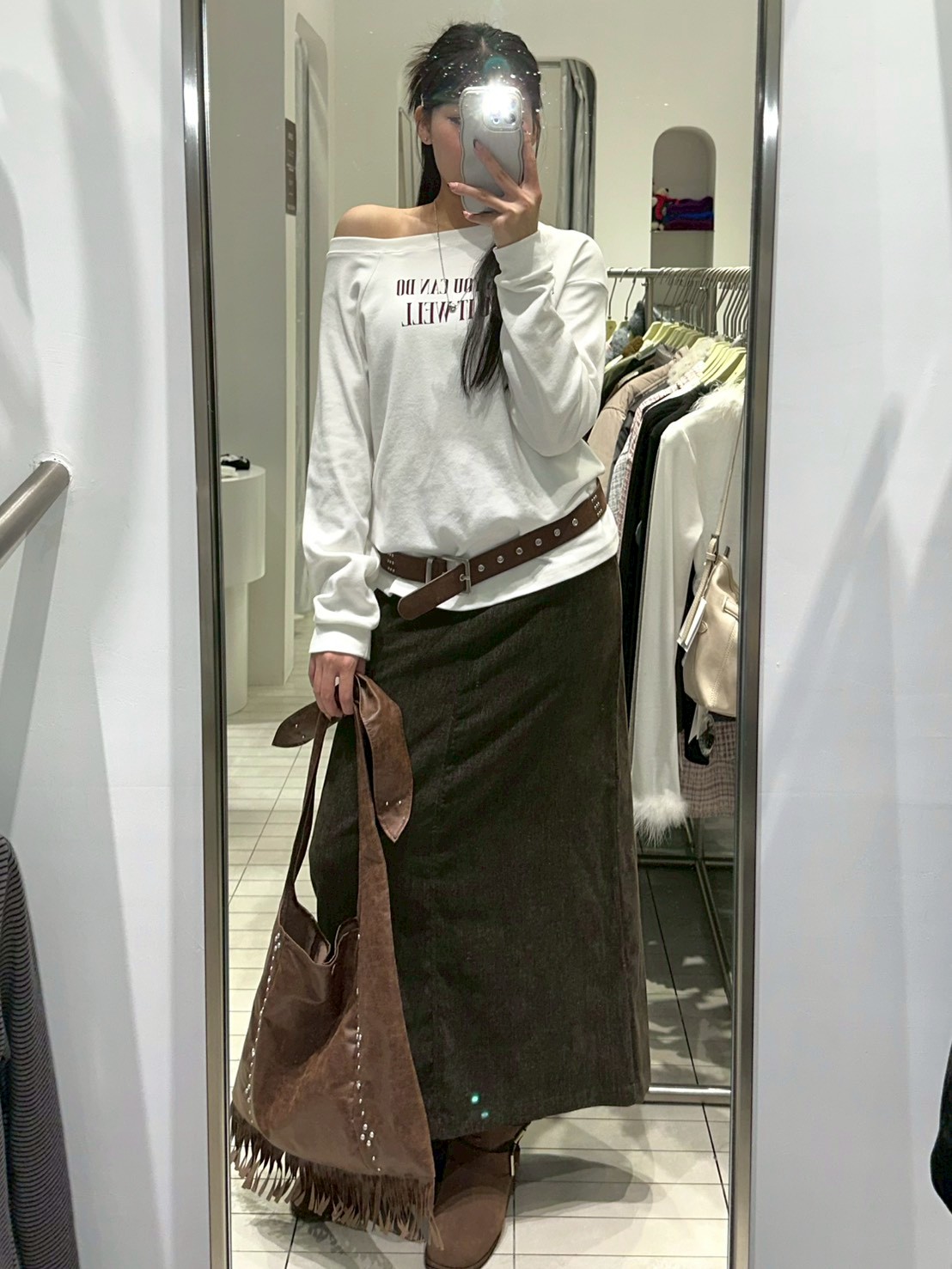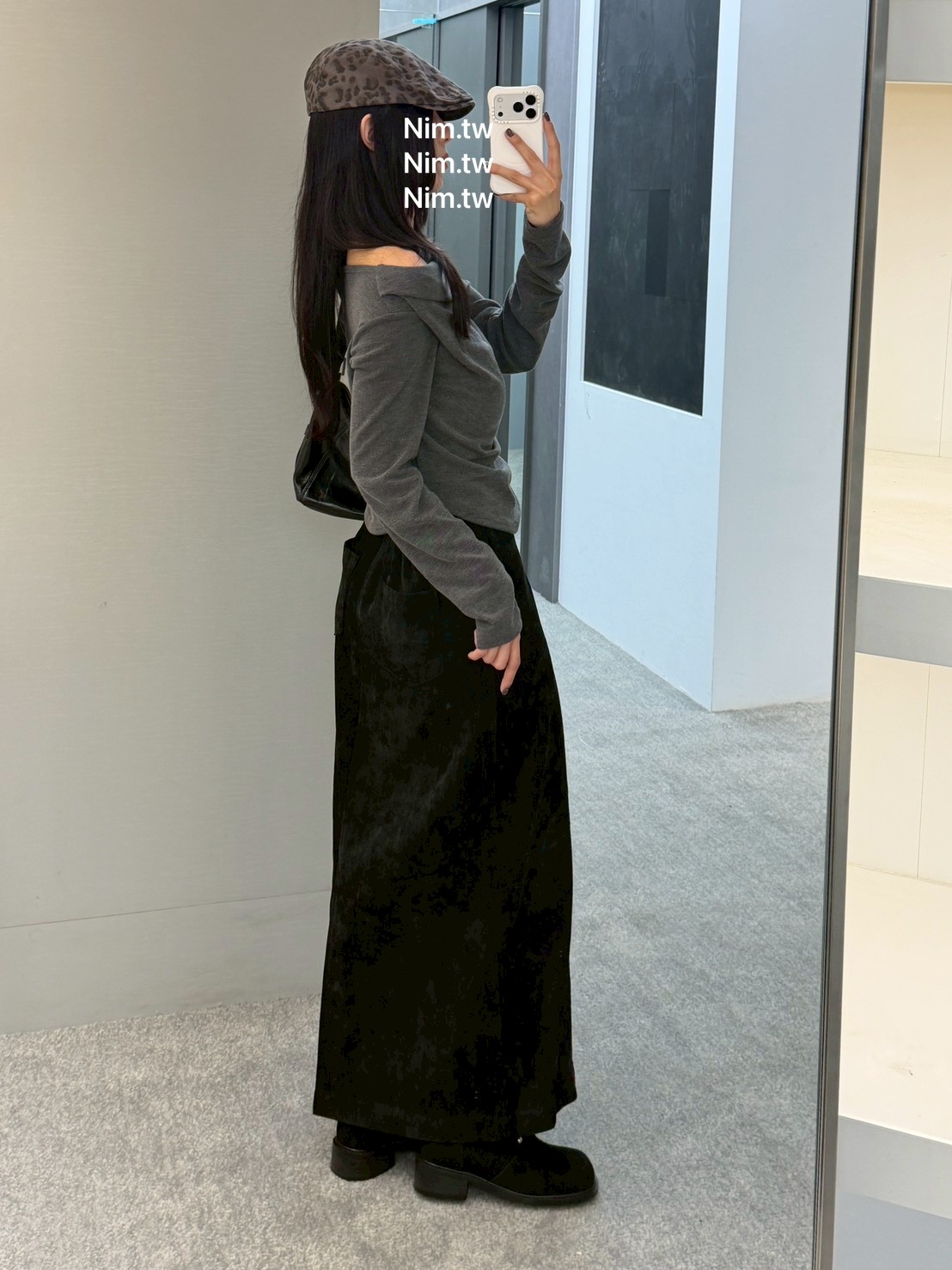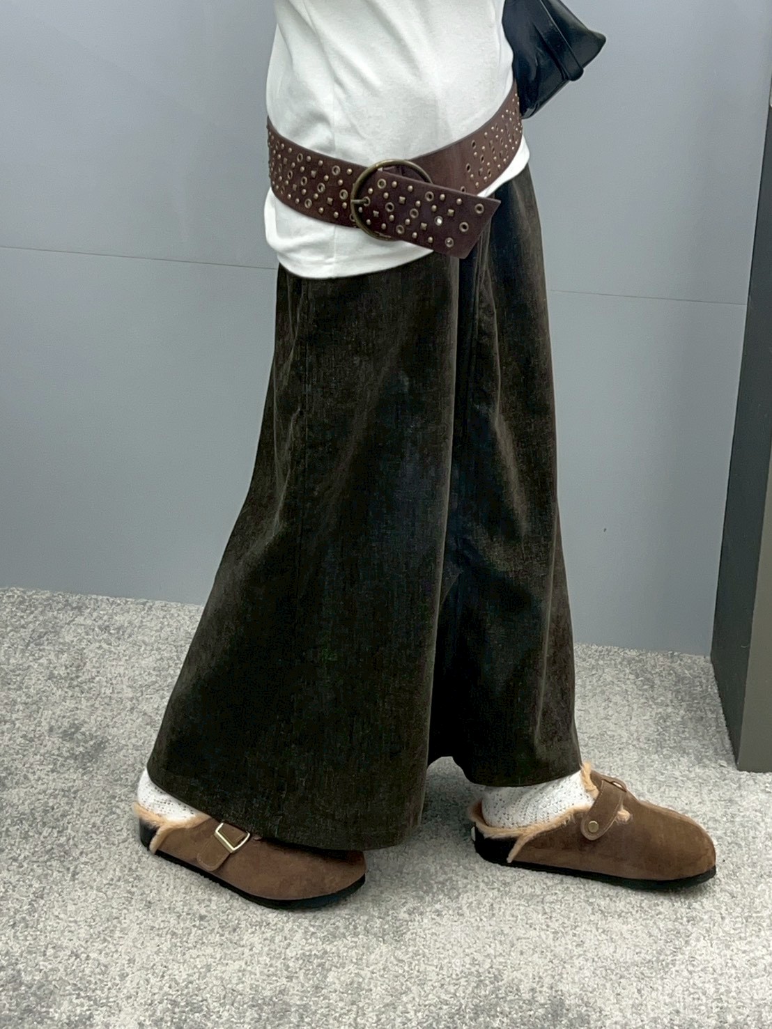 後口袋開岔紋理感絨布長裙