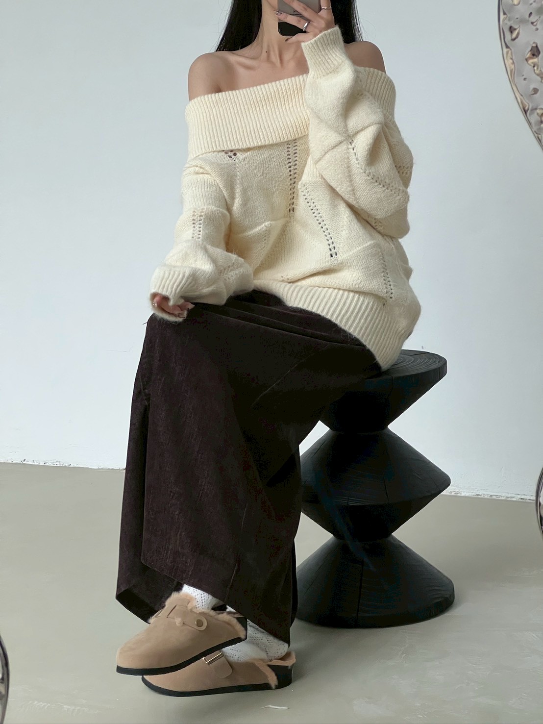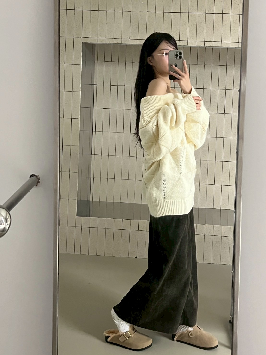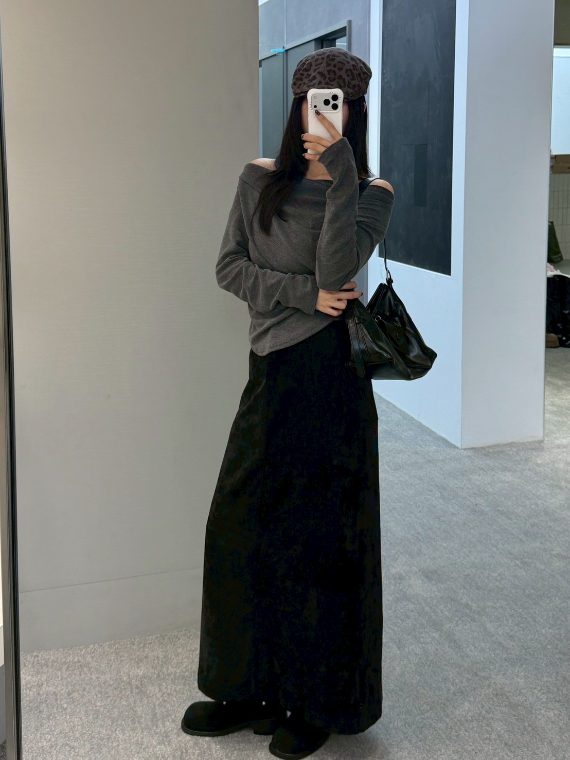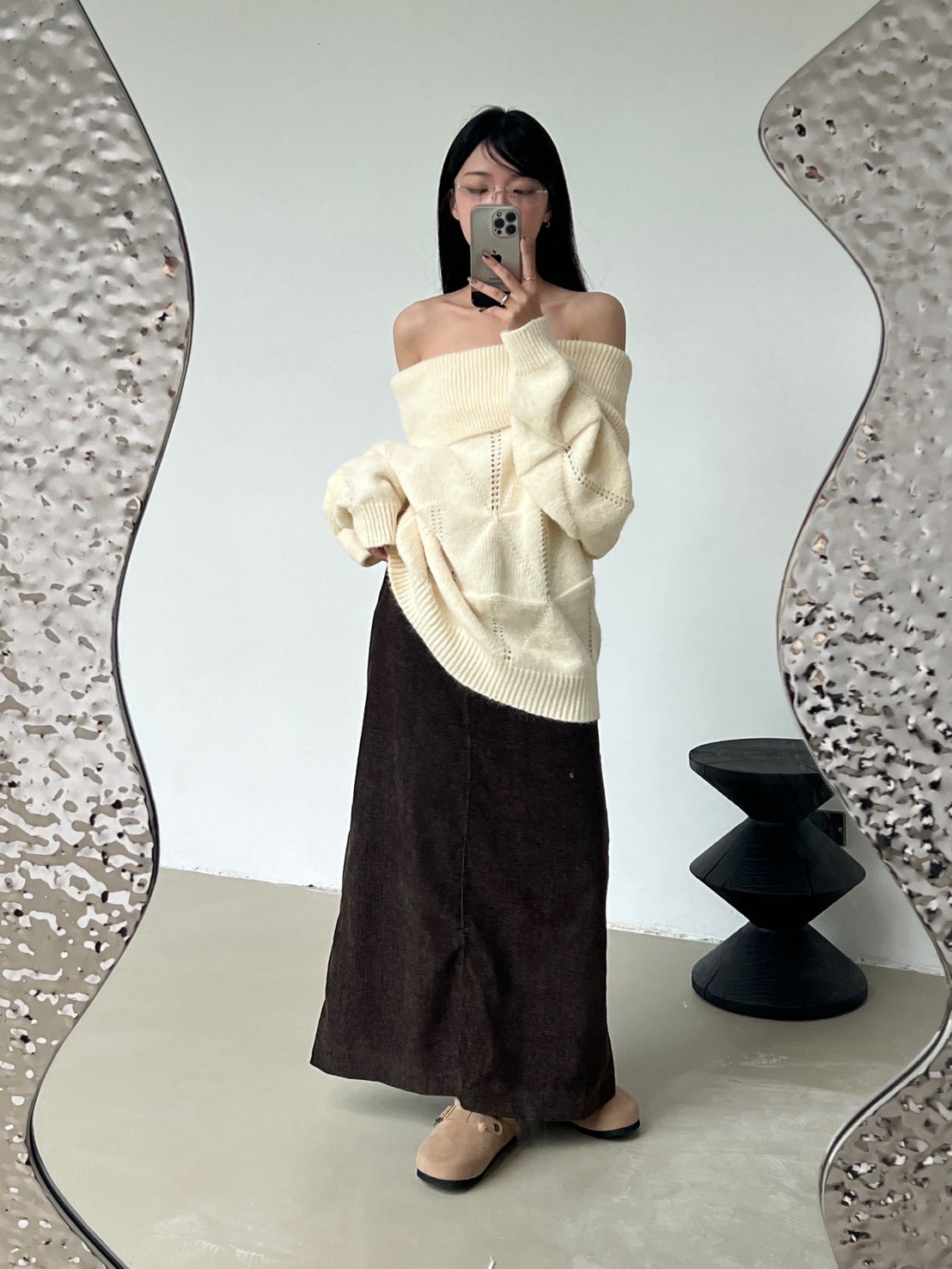 後口袋開岔紋理感絨布長裙